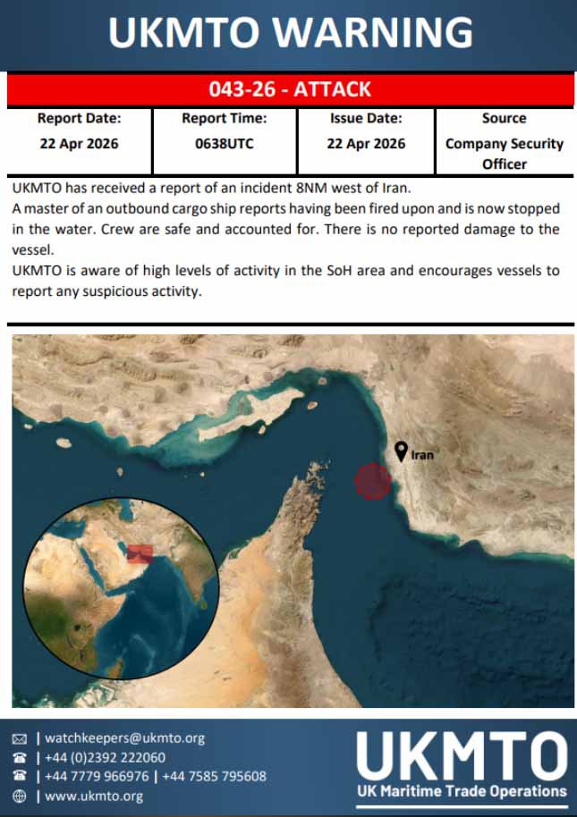 Start your day informed with Metro's News Updates newsletter or get Breaking News alerts the moment it happens.Iranian state news agency Nour News reported that the guards only opened fire as the vessel had ‘ignored the warnings’ of the armed forces.An Iranian security official told Al Jazeera that US-owned ships are ‘legitimate targets’ after the US seized the Iranian ship,Touska.Three container ships also attempted to cross the narrow,shallow Strait this morning before stopping near Iranian territorial waters,according to military observers.At least 3 Container ships attempted to cross the strait of Hormuz this morning:- Swiss-owned MSC Francesca (AIS switched off when crossing)- Greek-owned Epaminondas (AIS switched off)- UAE-owned EuphoriaThey are now stopped in/near Iranian territorial waters. https://t.co/rsEmGx2WqX pic.twitter.com/coq9HTFGkL— MenchOsint (@MenchOsint) April 22,2026Trump threatens to ‘blow up rest of Iran’